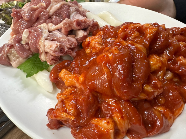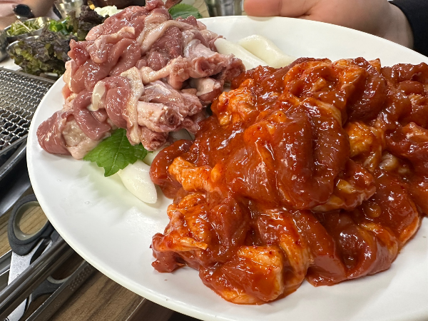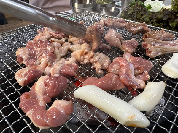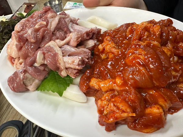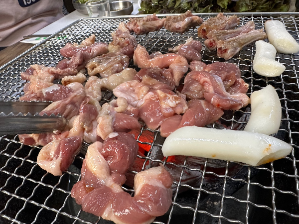 생오리를 먼저 구워먹고 그 다음에 양념고기를 구워먹었어요