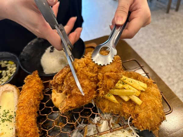 안심카츠과 통으로 나와서 잘라서 먹을 수 있게 집게와 가위를 함께 주셔요